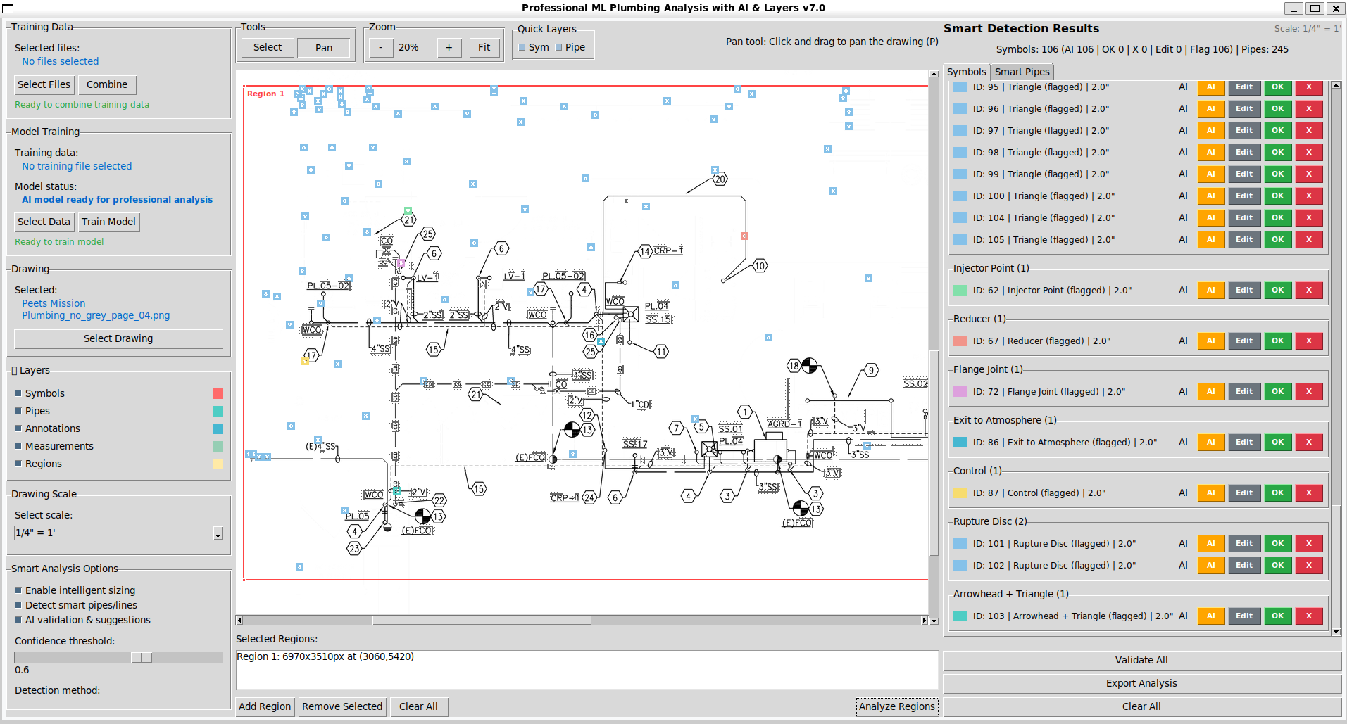 I’ve been working on an advanced computer vision application that automatically analyzes plumbing drawings and schematics using machine learning. The system identifies plumbing symbols (valves, fixtures, fittings), detects pipe runs with different line styles (hot water, cold water, sewage), and provides AI-powered validation against plumbing codes and best practices.